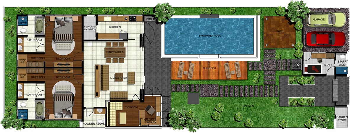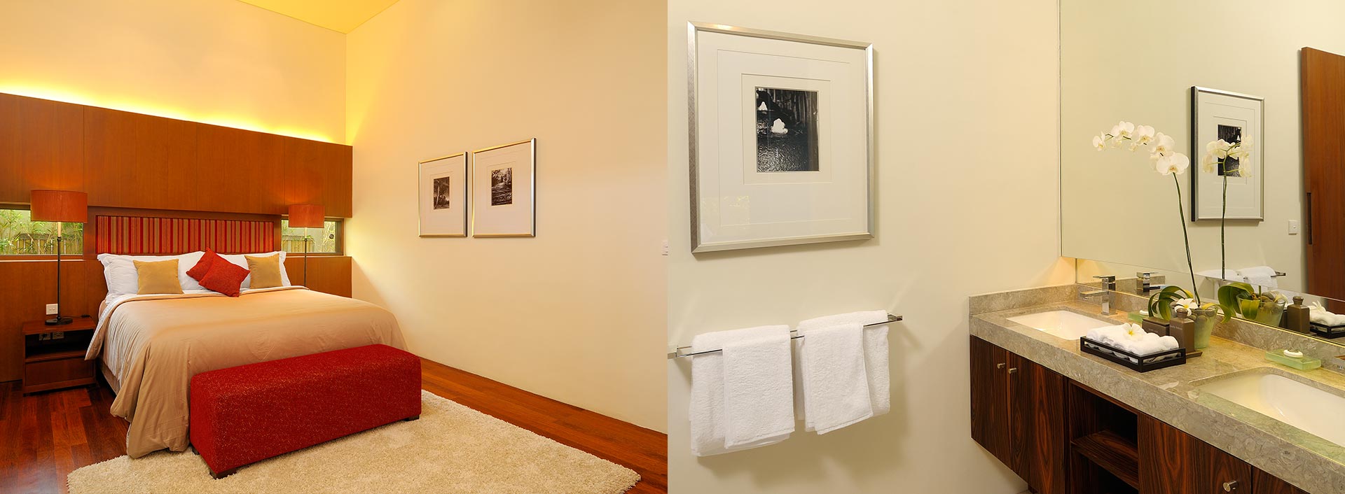 The villas 2 air-conditioned bedrooms complete with en-suite bathroom and large walk in closet sit under a soaring pitched roof. With a superb hanging chandelier the lighting at Villa Bamboo is second to none. Comfortable large sized beds made up with top quality linens and stylish bedcovers are very inviting. Glimpses of the tropical garden are seen through modern rectangular windows at the head of the beds. Enjoy the large flat screen TV's in both bedrooms from the comfort of your bed.